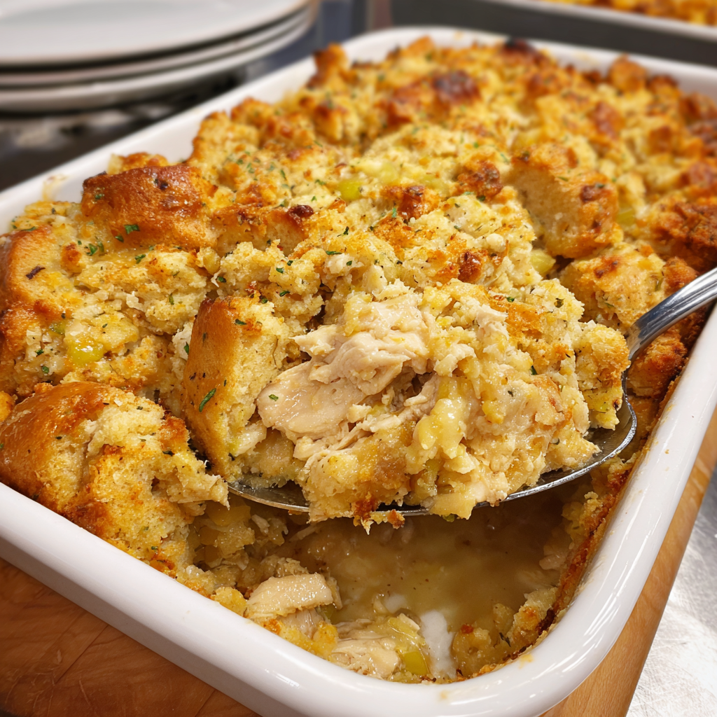 First, add the stuffing at the bottom layer, and then add some chicken. Again, add the stuffing, the remaining chicken and the broth mixed with the soup.