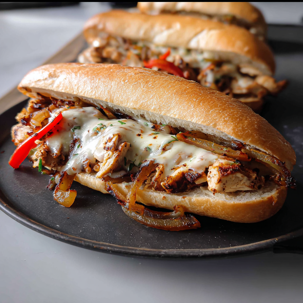 Spread the insides of the hoagie rolls with softened butter. Add cheese slices to both sides of the rolls. Fill the rolls with chicken, peppers, and onions.