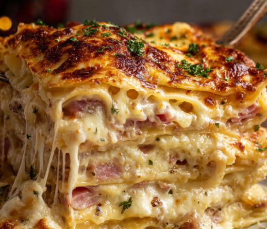 A rich, creamy twist on classic lasagna — layers of tender pasta, savory ham, and silky béchamel with melted cheese in every bite