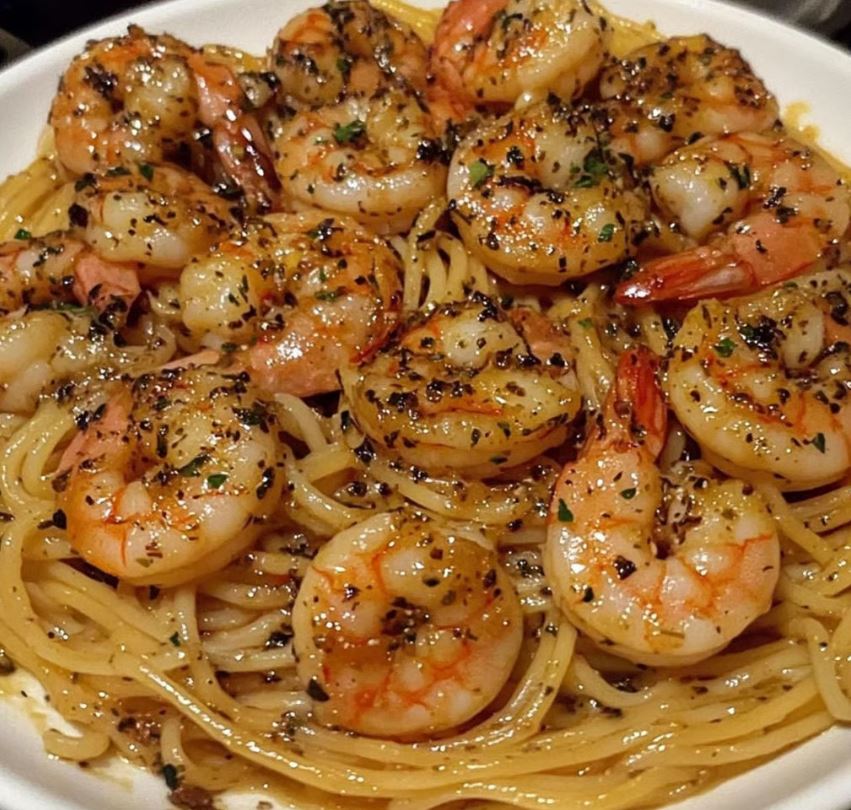 Drizzle in remaining olive oil. Add cooked pasta to the skillet with shrimp. Sprinkle in Italian seasoning, black pepper, red pepper flakes, and salt. Pour in 60 ml of reserved pasta water to moisten, adding more as needed.