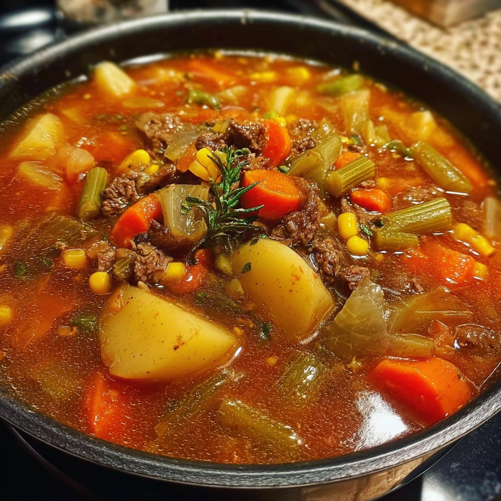 Stir in potatoes, cabbage, carrots, celery, corn, peas, green beans, lima beans and seasonings. Return to a boil. Reduce heat; simmer, covered, 35 minutes. Stir in okra; cook 15-20 minutes longer or until beef and vegetables are tender. Discard bay leaf.