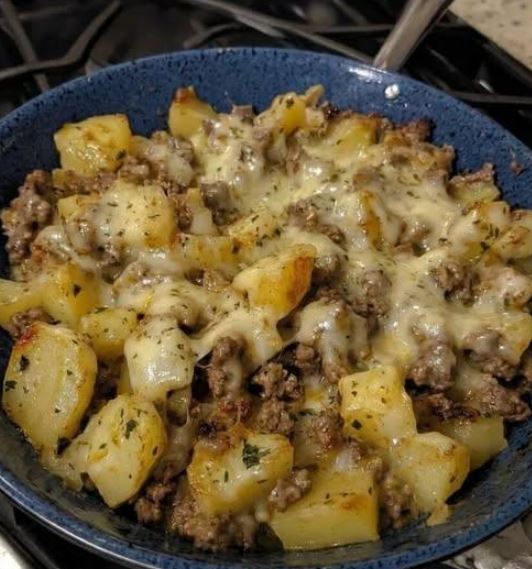 Place potato chunks in salted water and boil until just tender (about 8–10 minutes), then drain. Meanwhile, cook the ground beef with chopped onion and minced garlic in a large skillet until the meat is browned. Drain excess fat.