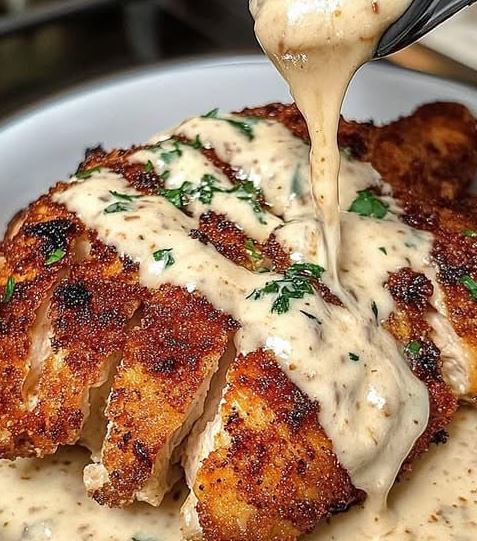 Plate the crispy chicken and drizzle generously with the warm garlic cream sauce.