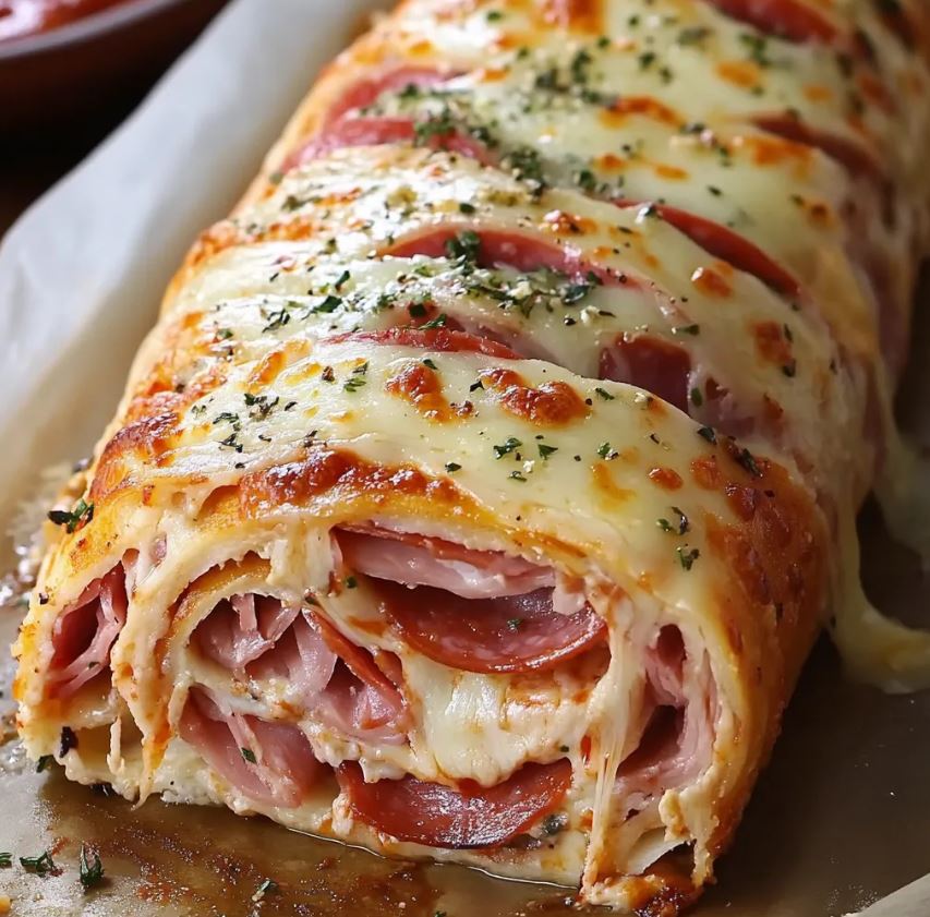 01 – Italian Stromboli is a savory and delicious dish that combines layers of deli meats, cheese, and a garlic butter topping all wrapped in a crispy pizza crust. It is perfect for a family dinner or a party appetizer.