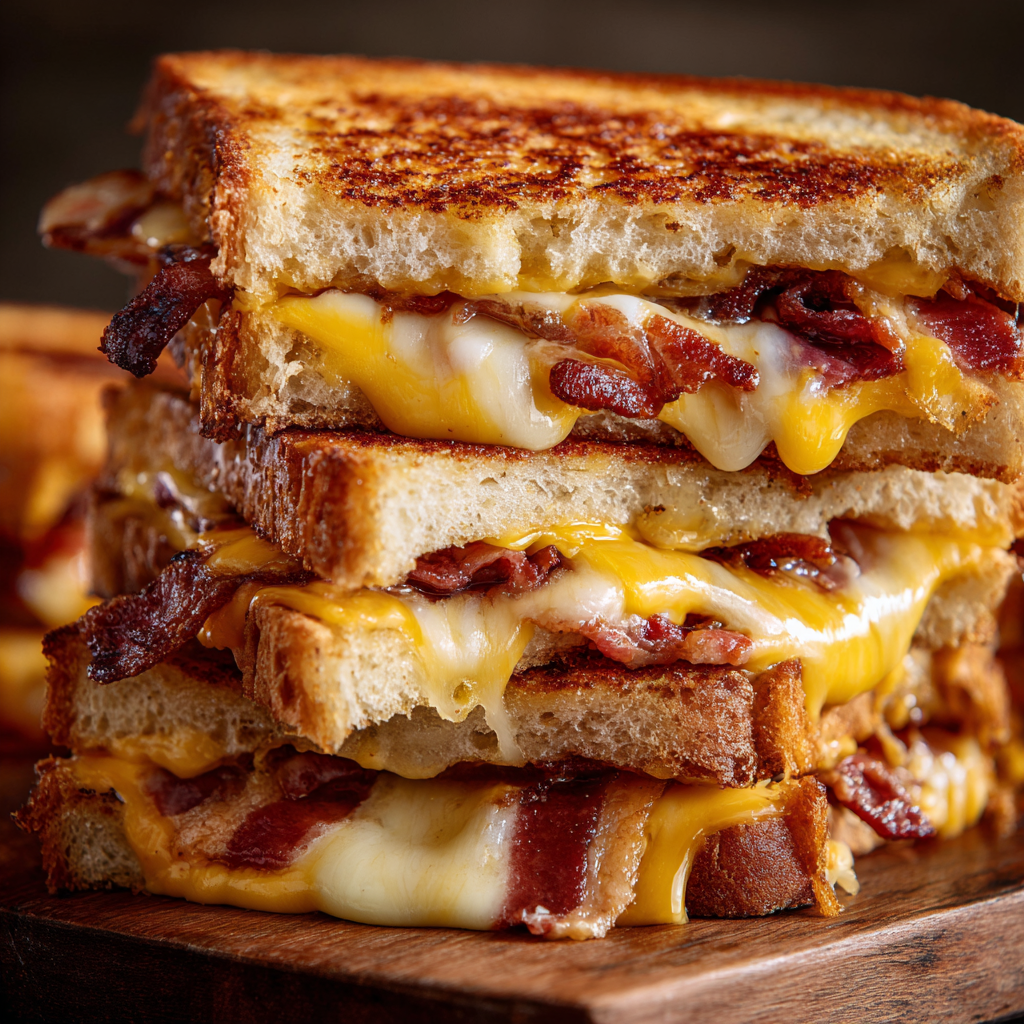 Place bread butter-side down in the skillet. Layer sharp cheddar, Monterey Jack, and Provolone cheeses on half of the bread slices. Add 2 strips of crispy bacon per sandwich on top of the cheese. Drizzle ranch dressing over the bacon and cheese. Top with remaining bread slices, butter-side up.